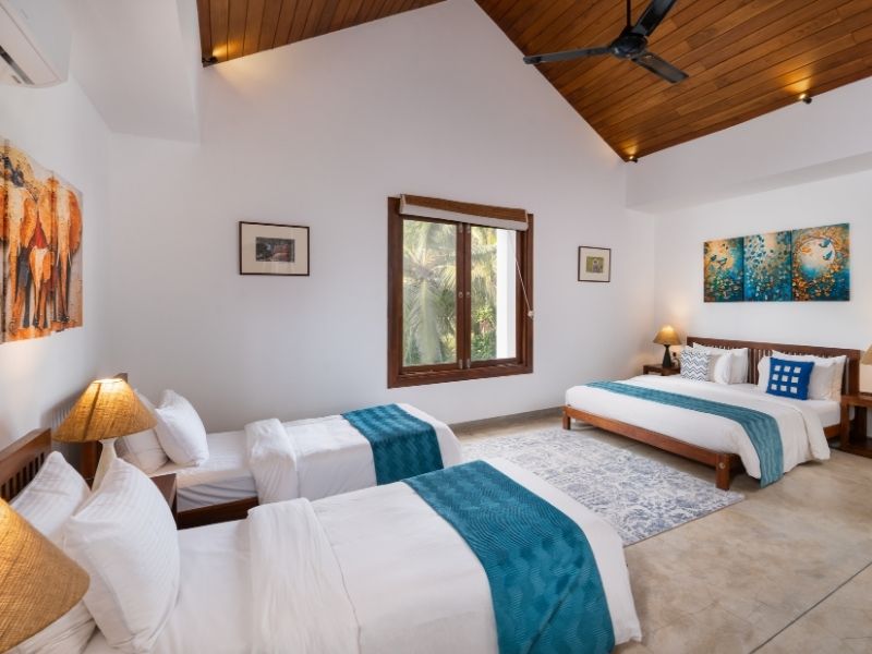 Designed for families and small groups, this spacious bedroom at Villa Tanderra offers flexible luxury accommodation in Tangalle, Sri Lanka. Featuring a king-size bed and two single beds, the room comfortably accommodates up to four guests, combining privacy, comfort, and beachfront villa living for a relaxed stay by the ocean.