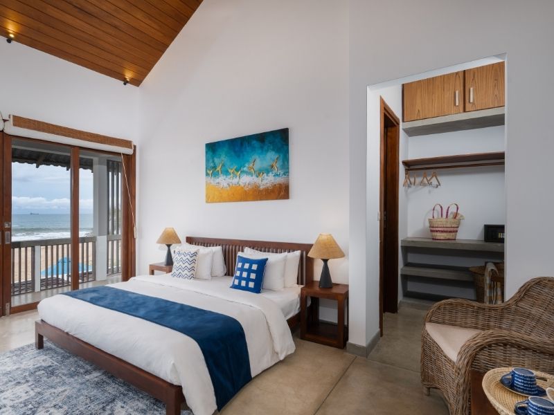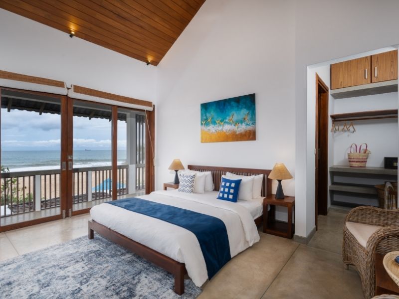 Each luxury bedroom at Villa Tanderra offers a king-size bed with crisp linens, air-conditond comfort, and a private en-suite bathroom with panoramic ocean views, creating a serene beachfront retreat in Tangalle, Sri Lanka.
